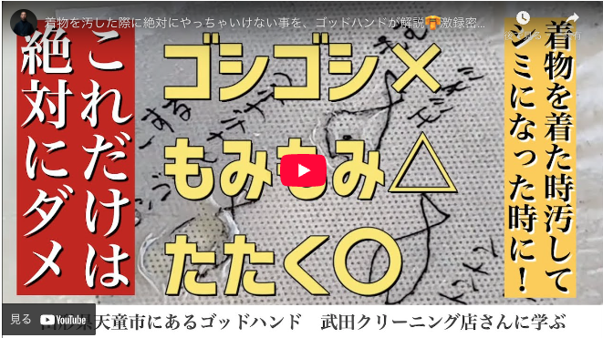 天童市にあるシミ抜きゴッドハンドと 浴衣のお手入れ事件簿動画を撮影 普通に浴衣お手入れって一口に言うけど なかなか専門性高く言えばさ こうなるよねって話。 浴衣の困った汚れがある人には 参考になるかも知れない動画です。 下記リンクは前回引用動画 着物を汚した際に絶対にやっちゃいけない事を 上手に説明しておいでです。