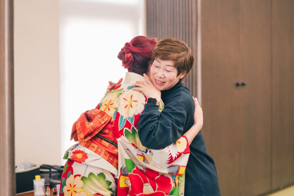 着物を着てヘアセット。担当してくださったのは、メイクアップアーティストの真田さんです。もともとはヘアセットのみの予定でしたが、「せっかくだから」と、メイクまでしてくださったのです。これぞ「神対応」という言葉がぴったり。仕事ぶりも声がけも対応も素晴らしい方です。