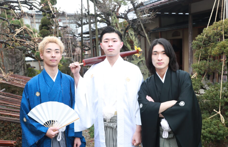 弥七は女子だけでなく、男子の着物姿も応援していますので、ぜひお声かけくださいね。女子の振袖姿同様に、着付から写真撮影まで包括的にお手伝いさせてもらってます。