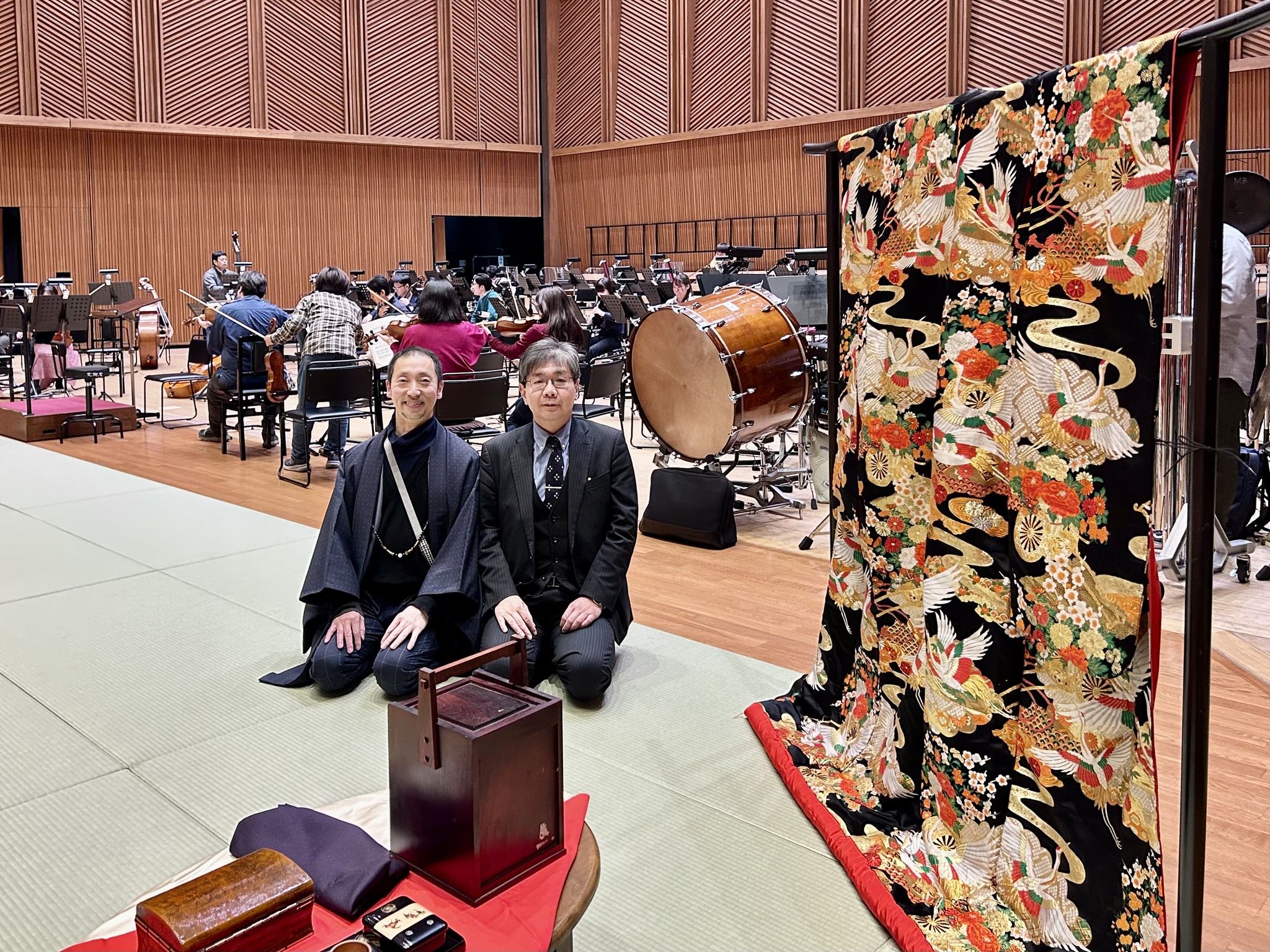 この度は山響専務 Hideki Nishihama さんよりお声がけ頂き、微力ながらお手伝いをさせてもらっています。ホールのステージに畳がひいてあるのを初めて見ました!!今日は打ち合わせということで、舞台構成・演出の太田さんとマッチアップ。太田さんの私物としてお持ちになられている着物を拝見させて頂きましたが、めっちゃ眼福の逸品がずしりで、ご馳走様でございました(^^)