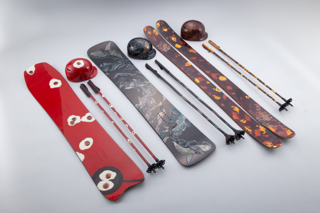 漆塗りのスノボ&スキー板のようです