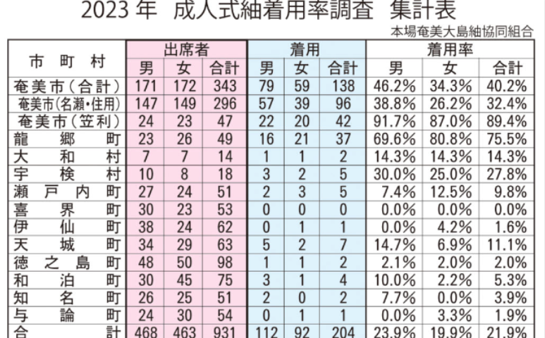奄美新聞社二十歳の集い紬着用率調査 より引用